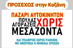 Πουλάς και αγοράζεις χωρίς μεσάζοντα – Στο χώρο του Πολυκαταστήματος “Αεροδρόμιο”, στο 4οχλμ. Κοζάνης – Λάρισας • ΠΑΖΑΡΙ ΑΥΤΟΚΙΝΗΤΩΝ Πουλάς και αγοράζεις χωρίς μεσάζοντα • ΥΠΑΙΘΡΙΟΣ ΧΩΡΟΣ ΣΤΑΘΜΕΥΣΗΣ (PARKING) ΑΥΤΟΚΙΝΗΤΩΝ Με ημερήσια και μηνιαία χρέωση • ΕΜΠΟΡΙΟ ΑΥΤΟΚΙΝΗΤΩΝ Ι.Χ. – Ημιεπαγγελματικά – Επαγγελματικά Φορτηγά – Αγροτικά Μηχανήματα • ΕΜΠΟΡΙΟ ΑΝΤΑΛΛΑΚΤΙΚΩΝ Μεταχειρισμένα και καινούρια Στο […]