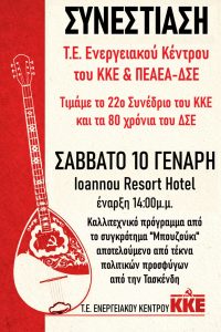 Η Τ.Ε. Ενεργειακού Κέντρου του ΚΚΕ και τα παραρτήματα της ΠΕΑΕΑ-ΔΣΕ διοργανώνουν συνεστίαση το Σάββατο 10 Γενάρη, στο Ioannou Resort Hotel στην Πτολεμαΐδα, με ώρα έναρξης στις 14:00μμ. Με τη συνεστίαση τιμάμε το 22ο Συνέδριο του ΚΚΕ και τα 80 χρόνια από την ίδρυση του Δημοκρατικού Στρατού Ελλάδας, αναδεικνύοντας την ιστορική προσφορά και τους αγώνες […]