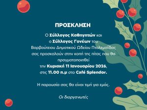 Με ιδιαίτερη χαρά σας προσκαλούμε στην εκδήλωση κοπής της βασιλόπιτας του “Συλλόγου Καθηγητών Βαρβούτειου Δημοτικού Ωδείου Πτολεμαΐδας” και του “Συλλόγου Γονέων & Κηδεμόνων ΒΔΩΠ¨, η οποία θα πραγματοποιηθεί την Κυριακή 11 Ιανουαρίου 2026 και ώρα 11.00 π.μ. στην καφετέρια Splendor στην Πτολεμαΐδα. Κατά τη διάρκεια της εκδήλωσης θα πραγματοποιηθεί και η βράβευση των μαθητών που απέκτησαν το […]