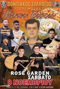 ΠΟΝΤΟΥ ΓΕΎΣΕΙΣ από τον Ποντιακό σύλλογο Πτολεμαϊδας . 8 Νοεμβρίου στις 9 μ.μ. σας περιμένουμε στην αίθουσα του Rose Garden να γευτείτε την ποντιακή κουζίνα και να διασκεδάσετε με ποντιακή μουσική και τραγούδι.