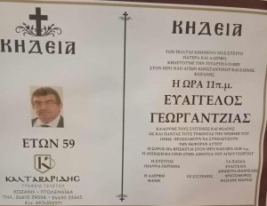 Έφυγε από την ζωή, σε ηλικία 59 ετών, ο Ε. Γεωργαντζιάς δημοτικός υπάλληλος στην υπηρεσία καθαριότητας του Δήμου Κοζάνης. Η κηδεία του θα γίνει την Τετάρτη 5/11 στις 11 το πρωί στον Ι.Ν. Αγ. Κωνσταντίνου & Ελένης.
