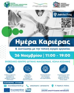 Η Μετάβαση Μ.Α.Ε., σε συνεργασία με το Επιμελητήριο Κοζάνης, διοργανώνουν την Ημέρα Καριέρας & Δικτύωσης με την τοπική αγορά εργασίας, την Τετάρτη 26 Νοεμβρίου 2025, από τις 11:00 έως τις 19:00, στο Εκθεσιακό Κέντρο Δυτικής Μακεδονίας στα Κοίλα Κοζάνης. Η εκδήλωση υλοποιείται με τη σύμπραξη του Πανεπιστημίου Δυτικής Μακεδονίας και του Δήμου Κοζάνης, στο […]