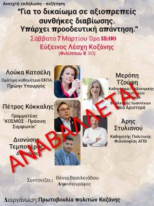 Η Πρωτοβουλία Πολιτών Κοζάνης σας ενημερώνει ότι η εκδήλωση – συζήτηση « Για αξιοπρεπείς συνθήκες διαβίωσης. Υπάρχει προοδευτική απάντηση.» , το Σάββατο 7 Μαρτίου , στις 6 το απόγευμα στην Εύξεινο Λέσχη Κοζάνης.( Φιλίππου Β 30) αναβάλλεται λόγω αλλαγής προγραμματισμού. Θα υπάρξει εκ νέου ανακοίνωση για την νέα ημερομηνία διεξαγωγής της. Πρωτοβουλία πολιτών Κοζάνης