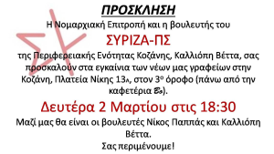 Η Νομαρχιακή Επιτροπή και η βουλευτής του ΣΥΡΙΖΑ-ΠΣ της Περιφερειακής Ενότητας Κοζάνης, Καλλιόπη Βέττα, σας προσκαλούν στα εγκαίνια των νέων μας γραφείων στην Κοζάνη, Πλατεία Νίκης 13Α, στον 3ο όροφο (πάνω από την καφετέρια Bo). Δευτέρα 2 Μαρτίου στις 18:30 Μαζί μας θα είναι οι βουλευτές Νίκος Παππάς και Καλλιόπη Βέττα. Σας περιμένουμε!