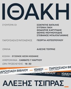 Οι εκδόσεις Gutenberg σας προσκαλούν το Σάββατο 7 Μαρτίου στην Εύξεινο Λέσχη Κοζάνης-Στέγη Ποντιακού Πολιτισμού (Φιλίππου Β 30, Κοζάνη) στην παρουσίαση του βιβλίου ΙΘΑΚΗ του Αλέξη Τσίπρα Για το ιστορικό και το πολιτικό αποτύπωμα του βιβλίου θα συζητήσουν οι: Σωκράτης Βατάλης Πολιτικός Μηχανικός Ευγενία Γάκη Εκπαιδευτικός Θόδωρος Καρυπίδης Πρώην Περιφερειάρχης – Δημοσιογράφος Θέμης Μουμουλίδης Σκηνοθέτης-συγγραφέας […]