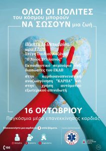 Η Στέγη Παιδιού Κοζάνης «ο Άγιος Στυλιανός» σε συνεργασία με το ΕΚΑΒ καλούν όλους στην εκδήλωση που θα γίνει στην αίθουσα εκδηλώσεων της Στέγης Παιδιού Κοζάνης (Βας. Φόρη 36) την Πέμπτη 16 Οκτωβρίου και ώρα 5:00 με σκοπό την ενημέρωση του κοινού για την ΚΑΡΠΑ, μια βασική τεχνική παροχής πρώτων βοηθειών καθώς επίσης και για […]