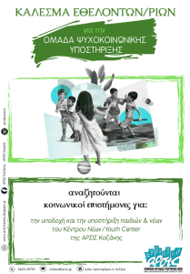 Η ομάδα ψυχοκοινωνικής υποστήριξης της ΑΡΣΙΣ Κοζάνης απευθύνει κάλεσμα σε εθελοντές και εθελόντριες που επιθυμούν να συμβάλουν ενεργά στην υποστήριξη ανθρώπων που ζουν σε συνθήκες φτώχειας και βιώνουν τις συνέπειες του κοινωνικού αποκλεισμού. Είσαι κοινωνικός/η επιστήμονας, κοινωνικός/η λειτουργός, κοινωνιολόγος, ψυχολόγος, κοινωνικός/ή ανθρωπολόγος, ή διαθέτεις σχετικό πτυχίο ή επαγγελματικό υπόβαθρο; Μπορείς να διαθέσεις 2 ώρες την […]