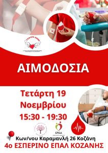 Την Τετάρτη 19 Νοεμβρίου 2025 και ώρα 15:30 – 19:30 στο χώρο του 4ου εσπερινού ΕΠΑΛ διοργανώνεται αιμοδοσία από τον Σ.Ε.Α «ΓΕΦΥΡΑ ΖΩΗΣ» σε συνεργασία με το τμήμα Αιμοδοσίας του «Μαμάτσειου» Γ. Ν. Κοζάνης, με τη συμμετοχή των μαθητών και διδασκόντων του ΕΠΑΛ. Την τελευταία χρονική περίοδο παρατηρήθηκε μειωμένη συλλογή αίματος, λόγω της […]