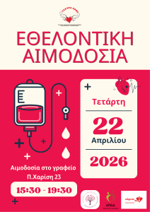 Την Τετάρτη 22 Απριλίου 2026, από τις 15:30 έως τις 19:30, στο γραφείο του συλλόγου μας (Π. Χαρίση 23), δίνουμε όλοι μαζί ένα ραντεβού ζωής. Η αιμοδοσία πραγματοποιείται σε συνεργασία με τον Σύλλογο Εθελοντών Αιμοδοτών Κοζάνης «Γέφυρα Ζωής» και το Τμήμα Αιμοδοσίας του Μαμάτσειου Νοσοκομείου. Παράλληλα, θα υπάρχει η δυνατότητα λήψης δείγματος σάλιου για την […]