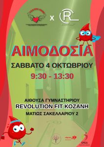 To Σάββατο 4 Οκτωβρίου 2025 από τις 09:30 – 14:00 (προσέλευση μέχρι 13:30) στο χώρο του γυμναστηρίου Revolution Fit (Ματιώς Σακελλαρίου 2) με την Αιμοδοσία του Γ.Ν. Κοζάνης. ΑΘΛΗΤΙΣΜΟΣ-ΥΓΕΙΑ-ΑΙΜΟΔΟΣΙΑ Φροντίζουμε την υγεία μας! Δίνουμε αίμα για όσους το χρειάζονται! Κάνε αυτό που θα ήθελες να κάνουν, στα δύσκολα, και οι άλλοι για […]