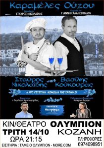Η παράσταση “Καραμέλες Ούζου” θα παρουσιαστεί την Δευτέρα 13 Οκτωβρίου στο Κιν/θέατρο Ολύμπιoν στην Καστοριά και την Τρίτη 14 Οκτωβρίου στο Κιν/θέατρο Ολύμπιον στην Κοζάνη στις 21:15. ΛΙΓΑ ΛΟΓΙΑ ΓΙΑ ΤΟ ΕΡΓΟ «Αγρια» νύχτα γεμάτη αστραπές, βροντές και …μυστήριο. Ποιος κλείδωσε τον βοηθό Σεφ και τον Σερβιτόρο στον τελευταίο όροφο του πολυτελούς ξενοδοχείου; Και γιατί […]
