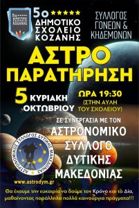Ο Σύλλογος Γονέων και Κηδεμόνων του Σχολείου μας, σε συνεργασία με τον Αστρονομικό Σύλλογο Δυτικής Μακεδονίας, διοργανώνει μια ξεχωριστή βραδιά αστροπαρατήρησης την Κυριακή 5 Οκτωβρίου 2025, στις 19:30, στην αυλή του 5ου Δημοτικού Σχολείου Κοζάνης. Μικροί και μεγάλοι θα έχουν την ευκαιρία να παρατηρήσουν μέσα από τηλεσκόπια τον Κρόνο, τον Δία και άλλα ουράνια σώματα, […]