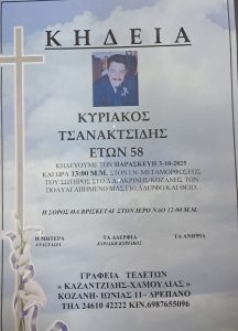 Την Παρασκευή 3/10, 1 το μεσημέρι, στην Ακρινή, η κηδεία του Κυριάκου Τσανακτσίδη.