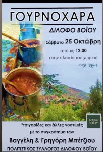 ΓΟΥΡΝΟΧΑΡΑ ΣΤΟ ΒΌΙΟ——————- Που? Δίλοφο-Δήμου Βοίου-Νομού Κοζάνης Πότε? Σάββατο 25 Οκτωβρίου 2025:Από τις 12.00 και μετά στην πλατεία του χωριού.:Ορχήστρα Βαγγέλης και Γόλης Μπέτζιος