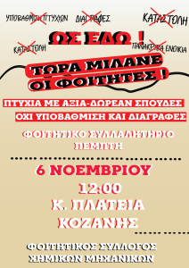 Η νέα ακαδημαϊκή χρονιά έχει ξεκινήσει εδώ και δυο βδομάδες και οι φοιτητές εκπέμπουμε “SOS” για τις σπουδές, τα πτυχία μας και την εργασιακή μας προοπτική, την κατάσταση στα πανεπιστήμια! Γι’ αυτό βγήκαμε στον δρόμο στην πανελλαδική απεργία στις 14/10, στέλνοντας μήνυμα ότι οι φοιτητές μαζί με τους εργαζόμενους απορρίπτουμε την πολιτική της κυβέρνησης […]