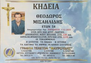 Την Παρασκευή 7/11 στον Ι.Ν. Αγ. Γεωργίου στο Διχείμαρρο Βοΐου η κηδεία του άτυχου 54χρονου που έφυγε, χθες, από την ζωή μετά το σοβαρό τραυματισμό από έκρηξη που είχε σημειωθεί στις 19 Σεπτεμβρίου, σε επιχείρηση με χωματουργικά μηχανήματα στο Τσοτύλι.