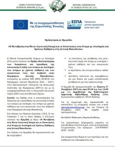 Στο πλαίσιο της Ημερίδας θα παρουσιαστούν και θα συζητηθούν: οι επιπτώσεις της μετάβασης στη μετα-λιγνιτική εποχή στα άτομα με αναπηρία, χρόνιες ή και σπάνιες παθήσεις και των οικογενειών τους, οι προκλήσεις που αντιμετωπίζουν, καθώς και προτάσεις πολιτικών και παρεμβάσεων για μια δίκαιη και χωρίς αποκλεισμούς μετάβαση σε μια νέα, πράσινη εποχή. Η […]