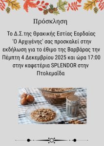 Η Θρακική Εστία Εορδαίας πιστή στις παραδόσεις και στα έθιμα,έτσι και φέτος τηρεί το έθιμο της Βαρβάρας το οποίο αποτελεί αναπόσπαστο κομμάτι της λαϊκής λατρευτικής παράδοσης της Θράκης και συνεχίζεται αδιάκοπα στο πέρασμα των αιώνων. Το Διοικητικό Συμβούλιο της Θρακικής Εστίας Εορδαίας προσκαλεί τα μέλη και τους φίλους του συλλόγου στην καθιερωμένη εκδήλωση για το […]
