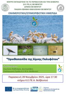 Το Κέντρο Εκπαίδευσης για το Περιβάλλον και την Αειφορία (Κ.Ε.ΠΕ.Α.) Βελβεντού, σε συνεργασία με τον Δήμο Βελβεντού και την Παιδική & Εφηβική Βιβλιοθήκη Βελβεντού, διοργανώνει Επιμορφωτική/Ενημερωτική Ημερίδα, την Παρασκευή 28 Νοεμβρίου 2025 και ώρα 17.30, με τίτλο «Ορνιθοπανίδα της λίμνης Πολυφύτου», στις εγκαταστάσεις του στο Βελβεντό. Η Ημερίδα απευθύνεται σε εκπαιδευτικούς, μαθητές/τριες και πολίτες που […]