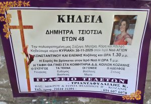 Έφυγε από την ζωή, σε ηλικία 48 ετών, η Δήμητρα Τσιότσια. Πρόσχαρη και πάντα με το χαμόγελο η Δήμητρα ήταν ιδιαίτερα αγαπητή στην τοπική κοινωνία. Η κηδεία της θα γίνει την Κυριακή 30/11 στον Ι.Ν. Αγ. Κωνσταντίνου & Ελένης στη 1:30 το μεσημέρι. Θερμά συλλυπητήρια στην οικογένεια.