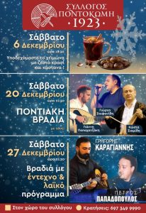 Σύλλογος «Ποντοκώμη 1923» – Τρεις ημέρες γεμάτες καλή διάθεση, χορό, μουσική και τραγούδια / 6 – 20 – 27 Δεκεμβρίου στο χώρο του συλλόγου ! -Σάββατο 6 Δεκεμβρίου – ώρα 18:30 Υποδεχόμαστε το χειμώνα με ζεστό κρασί και κάστανα. Τον καλωσορίζουμε με γεύσεις, χαμόγελα και καλή διάθεση ! -Σάββατο 20 Δεκεμβρίου – ώρα 21:30 Ποντιακή […]