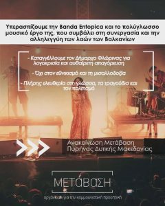 – Καταγγέλλουμε τον Δήμαρχο Φλώρινας για λογοκρισία και αυθαίρετη απαγόρευση – Όχι στον εθνικισμό και τη μισαλλοδοξία – Πλήρης ελευθερία στη γλώσσα, τα τραγούδια και τον πολιτισμό Καταγγέλλουμε ως μισαλλόδοξη και εμφυλιοπολεμική την ενέργεια του Δημάρχου Φλώρινας, Βασίλη Γιαννάκη, που ως αυτόκλητος εισαγγελέας και αστυνομικός, επιχείρησε να λογοκρίνει και να απαγορεύσει στο γνωστό συγκρότημα Banda […]