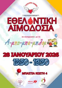 3η Εθελοντική Αιμοδοσία για το 2026 Κάνε τον κόσμο ομορφότερο – Χάρισε Αίμα! Την Τετάρτη 28 Ιανουαρίου 2026, από 15:30 έως 19:30, σας προσκαλούμε σε εθελοντική αιμοδοσία που θα πραγματοποιηθεί στο Α-ΜΠΕ-ΜΠΑ-ΜΠΛΟΜ! (Βρεφονηπιακός Σταθμός – Νηπιαγωγείο – Κ.Δ.Α.Π) , Κωστή Μπαστιά 4, σε συνεργασία με την Αιμοδοσία του «Μαμάτσειου» Γενικού Νοσοκομείου Κοζάνης. Παράλληλη […]