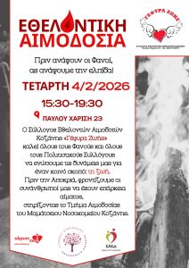 Η εθελοντική αιμοδοσία θα πραγματοποιηθεί την Τετάρτη 4 Φεβρουαρίου 2026, από τις 15:30 έως τις 19:30, στα γραφεία του Συλλόγου, Παύλου Χαρίση 23. Ενόψει της Αποκριάς, είναι ιδιαίτερα σημαντικό να διασφαλίσουμε την επάρκεια αίματος για τους συνανθρώπους μας, στηρίζοντας έμπρακτα το Τμήμα Αιμοδοσίας του Μαμάτσειου Γενικού Νοσοκομείου Κοζάνης. Ο Σύλλογος Εθελοντών Αιμοδοτών Κοζάνης «Γέφυρα Ζωής» […]