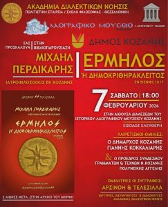 Το Σάββατο 7 Φεβρουαρίου και ώρα 18.00 Η ΑΚΑΔΗΜΙΑ ΔΙΑΛΕΚΤΙΚΩΝ ΝΟΗΣΗΣ, ο ΔΗΜΟΣ ΚΟΖΑΝΗΣ και ο ΣΥΝΔΕΣΜΟΣ ΓΡΑΜΜΑΤΩΝ ΚΑΙ ΤΕΧΝΩΝ Ν. ΚΟΖΑΝΗΣ σας προσκαλούν στην Βιβλιοπαρουσίαση Μιχαήλ Περδικαρης Ιατροφιλόσοφος από την Κοζάνη <ΕΡΜΗΛΟΣ ΔΗΜΟΚΡΙΘΗΡΑΚΛΕΙΤΟΣ εν Βιέννη 1817> Η παρουσίαση θα γίνει στην αίθουσα διαλέξεων του Λαογραφικού Μουσείου. ΕΙΣΟΔΟΣ ΕΛΕΥΘΕΡΗ