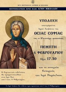 Ιδιαίτερη τιμή και ευλογία για την Τοπική μας Εκκλησία συνιστά η έλευση αποτμήματος Ιερού Λειψάνου της Οσίας Σοφίας της εν Κλεισούρα ασκησάσης. Το Ιερό Λείψανο θα κομίσει την Πέμπτη 5 Φεβρουαρίου και ώρα 5.30 μ.μ., στον Μητροπολιτικό Ιερό Ναό Αγίου Νικολάου, πολιούχου Κοζάνης ο Σεβασμιώτατος Μητροπολίτης Σερβίων & Κοζάνης κ. Παύλος. Το Ιερό σέβασμα θα […]