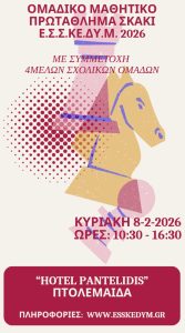 Η Ένωση Σκακιστικών Σωματείων Κεντρικής και Δυτικής Μακεδονίας, σε συνεργασία με τους Σκακιστικούς Συλλόγους Πτολεμαΐδας, διοργανώνει Ομαδικούς Μαθητικούς Αγώνες Σκάκι, με ανοιχτή συμμετοχή, από όλα τα σχολεία των Περιφερειακών Ενοτήτων, Γρεβενών, Ημαθίας, Καστοριάς, Κιλκίς, Πέλλας, Πιερίας, Κοζάνης και Φλώρινας, την Κυριακή 08-02-2026 και ώρα 10:30 π.μ. – 16:30 στο «PANTELIDIS HOTEL & SPA 4*» στην […]