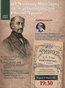 Ο Δήμος Βοΐου, στο πλαίσιο των επετειακών εκδηλώσεων για τον εορτασμό της Εθνικής Επετείου της 25ης Μαρτίου 1821, σας προσκαλεί στην εκδήλωση με τίτλο: «Ο Νικόλαος Μάντζαρος και οι μελοποιήσεις του Εθνικού Ύμνου». Πρόκειται για μια εκλαϊκευμένη παρουσίαση που αναδεικνύει άγνωστες πτυχές της ιστορίας του Εθνικού μας Ύμνου, μέσα από την επιστημονική έρευνα. Εισηγητής της […]