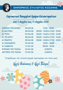 Ο Εμπορικός Σύλλογος Κοζάνης ανακοινώνει το εορταστικό ωράριο των καταστημάτων κατά την περίοδο του Πάσχα. Ευχόμαστε καλές δουλειές σε όλους τους συναδέλφους, μία περίοδο που όλοι την περιμένουμε για να ανακάμψει η κίνηση στην Αγορά μας. Επίσης υγεία αλλά και ειρήνη που τόσο πολύ τη χρειάζεται ο κόσμος. Καλή και Ευλογημένη Ανάσταση!