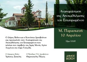 Ο Δήμος Βοΐου και η Κοινότητα Δρυοβούνου σας προσκαλούν στην Αναπαράσταση της Αποκαθήλωσης του Εσταυρωμένου, που τελείται στον περίβολο της Ιεράς Μονής Αγίου Λογγίνου, στο λόφο Γολγοθά.