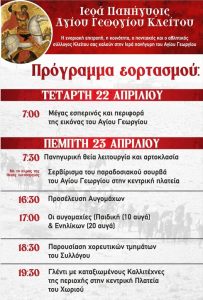 Με θρησκευτική κατάνυξη αλλά και πλούσιο πρόγραμμα πολιτιστικών εκδηλώσεων θα τιμηθεί και φέτος η Ιερά Πανήγυρις του Αγίου Γεωργίου στον Κλείτο Κοζάνης, με τη διοργάνωση της Ενοριακής Επιτροπής, της Κοινότητας, καθώς και του Πολιτιστικού και Αθλητικού Συλλόγου Κλείτου. Οι εκδηλώσεις θα πραγματοποιηθούν την Τετάρτη 22 και την Πέμπτη 23 Απριλίου. Αναλυτικά το πρόγραμμα: Τετάρτη 22 […]