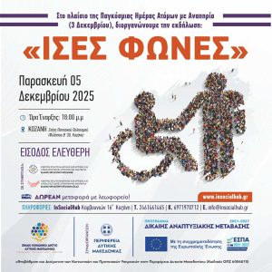 Ο Σύλλογος Γονέων Κηδεμόνων και Φίλων Ατόμων με Αναπηρία Περιφέρειας Δυτικής Μακεδονίας σας καλεί στην Χριστουγεννιάτικη γιορτή που θα πραγματοποιηθεί την Κυριακή 14 Δεκεμβρίου 2025 και ώρα 17.00μ.μ. στο ξενοδοχείο “IOANNOU RESORT” Με τιμή Το Δ.Σ. ΕΙΣΟΔΟΣ ΕΛΕΥΘΡΗ Η εκδήλωση καλύπτεται οικονομικά από την οικογένεια του κ. Σάββα Μεντεκίδη (αίθουσα, κεράσματα, δώρα παιδιών). Καλεσμένοι μας: […]