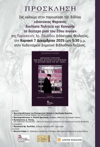 Οι εκδόσεις Κ Μ Σταμούλη και το βιβλιοπωλείο η Στοά του βιβλίου σας προσκαλούν στην παρουσίαση του βιβλίου «Διονύσιος Ψαριανός Εκκλησία Πολιτεία και Κοινωνία το δεύτερο μισό του 20ου αιώνα» της Παρασκευής Χρ. Παυλίδου Διδάκτορος θεολογίας, την Κυριακή 7 Δεκεμβρίου στις 5:30μ.μ. στην Κοβεντάρειο Δημοτική Βιβλιοθήκη Κοζάνης. Ομιλητές: · Πρωτοπρεσβύτερος του Οικουμενικού Θρόνου π. Δημήτριος […]