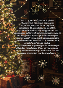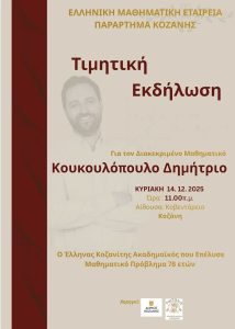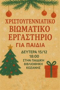 Το Κέντρο Πρόληψης Π.Ε. Κοζάνης «Ορίζοντες» (σε συνεργασία με τον ΕΟΠΑΕ), στο πλαίσιο των Χριστουγεννιάτικων εκδηλώσεων του Δήμου Κοζάνης, θα πραγματοποιήσει βιωματικό εργαστήρι για παιδιά, ελάτε να περάσουμε ένα απόγευμα γεμάτο παραμύθια, ιστορίες, ζωγραφική και χειροτεχνίες και να ζήσουμε μαζί τη μαγεία των Χριστουγέννων ! Δευτέρα 15/12/2025, 18.00 το απόγευμα στην παιδική βιβλιοθήκη Κοζάνης […]