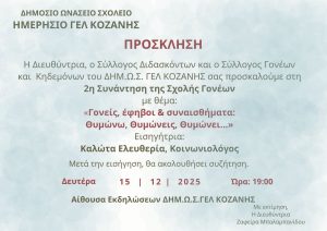 Το ΔΗΜ.Ω.Σ. ΗΜΕΡΗΣΙΟ ΓΕΝΙΚΟ ΛΥΚΕΙΟ ΚΟΖΑΝΗΣ, στο πλαίσιο λειτουργίας της Σχολής Γονέων, προγραμματίζει τη 2η Συνάντηση, τη Δευτέρα 15 Δεκεμβρίου 2025 και ώρα 19:00, στην Αίθουσα Εκδηλώσεων του ΔΗΜ.Ω.Σ. ΗΜΕΡΗΣΙΟΥ ΓΕΝΙΚΟΥ ΛΥΚΕΙΟΥ ΚΟΖΑΝΗΣ, (Μακρυγιάννη 24, Κοζάνη) με την Κοινωνιολόγο, κυρία Καλώτα Ελευθερία, με θέμα: «Γονείς, έφηβοι & συναισθήματα: Θυμώνω, Θυμώνεις, Θυμώνει…» Στόχος της συμβουλευτικής συνάντησης […]