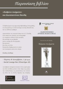 Την Πέμπτη 18 Δεκεμβρίου 2025, στις 7.30 μ.μ., στο Social Lounge Bar (Πλαστήρα 18), τα Διάφανα ποιήματα ανοίγουν έναν μικρό χώρο για όσα συνήθως μένουν στην άκρη της μέρας: την ευαλωτότητα, τις μετατοπίσεις του εαυτού, τις σκιές και τις λεπτές λάμψεις της ύπαρξης. Το Βιβλιοτεχνείο της Δημοτικής Βιβλιοθήκης Πτολεμαΐδας, σε συνεργασία με το Πανεπιστήμιο Δυτικής […]