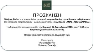 Ο Δήμος Βοΐου σας προσκαλεί στην τελετή ονοματοδοσίας της αίθουσας εκδηλώσεων του Ιστορικού Τραμπαντζείου Γυμνασίου Σιάτιστας σε Αίθουσα «ΑΝΑΣΤΑΣΙΟΣ ΔΑΡΔΑΣ». Η εκδήλωση θα πραγματοποιηθεί την Κυριακή 14 Δεκεμβρίου 2025, στις 11:00, στο Τραμπάντζειο Γυμνάσιο Σιάτιστας. Η παρουσία σας θα αποτελέσει ξεχωριστή τιμή. Με εκτίμηση, Ο Δήμαρχος Βοΐου