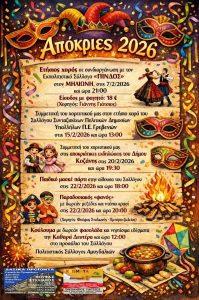 Την Κυριακή 25 Ιανουαρίου 2026 ένα μεγάλο παραδοσιακό γλέντι, γεμάτο χορό, τραγούδι και κέφι! Στο τραγούδι: Στέλιος Παπαδήμας & Απόστολης Μυρωτής