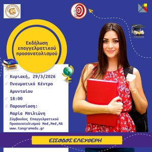 Ο Δήμος Αμυνταίου σας προσκαλεί στην εκδήλωση επαγγελματικού προσανατολισμού, η οποία θα πραγματοποιηθεί την Κυριακή 29 Μαρτίου 2026, στις 18:00, στο Πνευματικό Κέντρο Αμυνταίου. Την εκδήλωση θα παρουσιάσει η Μαρία Μπιλιώνη, Σύμβουλος Επαγγελματικού Προσανατολισμού. Η εκδήλωση απευθύνεται σε μαθητές, γονείς, εκπαιδευτικούς και σε κάθε νέο που θέλει να ενημερωθεί για τις επιλογές σπουδών και τις […]