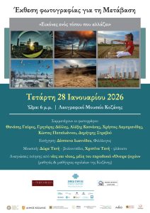 Έκθεση φωτογραφίας για τη Μετάβαση, με τίτλο «Εικόνες ενός τόπου που αλλάζει» πρόκειται θα πραγματοποιηθεί την Τετάρτη 28 Ιανουαρίου, στις 18:00, στο Λαογραφικό Μουσείο Κοζάνης. Συμμετέχουν οι φωτογράφοι: Θανάσης Γαύρος, Γρηγόρης Δάλλης, Αλέξης Κασνάκης, Χρήστος Λαμπριανίδης, Κώστας Παπαιωάννου και Δημήτρης Στραβού. Η εκδήλωση πραγματοποιείται στο πλαίσιο της δράσης «Μετά-Τοπίο: Πολιτισμός και βιώσιμη Ανάπτυξη στη Δυτική […]