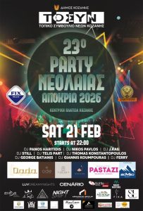 Το Σάββατο της Μεγάλης Αποκριάς 21 Φεβρουαρίου 2026 στις 22:00 το βράδυ, σας περιμένουμε όλες και όλους στην κεντρική πλατεία Νίκης της Κοζάνης, για το εμβληματικό Party Νεολαίας της Κοζανίτικης Αποκριάς, όπου το κέφι, η χαρά και το ξεφάντωμα θα έχουν τον πρώτο λόγο, στο κορυφαίο αυτό αποκριάτικο μουσικό γεγονός που διοργανώνει κάθε χρόνο, το […]