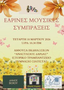 Τετάρτη 18 Μαρτίου Ώρα: 10:30 π.μ. Αίθουσα Εκδηλώσεων «Αναστάσιος Δάρδας» Ιστορικό Τραμπάντζειο Γυμνάσιο Σιάτιστας Η εκδήλωση πραγματοποιείται σε συνεργασία με το Ενιαίο Ειδικό Επαγγελματικό Γυμνάσιο – Λύκειο Καστοριάς Σας περιμένουμε να μοιραστούμε μαζί τη χαρά της μουσικής και της δημιουργίας!