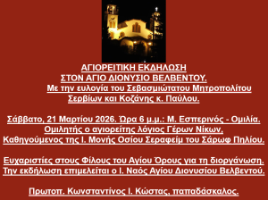 Με την ευλογία του Σεβασμιώτατου Μητροπολίτου Σερβίων και Κοζάνης κ. Παύλου. Σάββατο, 21 Μαρτίου 2026. Ώρα 6 μ.μ.: Μ. Εσπερινός – Ομιλία. Ομιλητής ο αγιορείτης λόγιος Γέρων Νίκων, Καθηγούμενος της Ι. Μονής Οσίου Σεραφείμ του Σάρωφ Πηλίου. Ευχαριστίες στους Φίλους του Αγίου Όρους για τη διοργάνωση. Την εκδήλωση επιμελείται ο Ι. Ναός Αγίου Διονυσίου […]