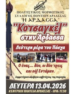 Ο Πολιτιστικός Μορφωτικός Σύλλογος Ποντίων Άρδασσας «Η Άρδασσα» σας προσκαλεί στην αναβίωση του ποντιακού εθίμου «Κοτσαγκέλ». Κεντρική Πλατεία Άρδασσας Δευτέρα 13 Απριλίου 2026 (2η ημέρα Πάσχα) Ώρα: 17:30 Με τη συμμετοχή καταξιωμένων καλλιτεχνών και πλούσιο παραδοσιακό πρόγραμμα. Η παρουσία σας θα μας τιμήσει ιδιαίτερα!