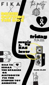 Ένα ξεχωριστό απόγευμα με μουσική, διάθεση και κυρίως μήνυμα στήριξης διοργανώνει το FIKA (11ης Οκτωβρίου 53) μαζί με τη νεολογία Κασαιρειάς την Παρασκευή 17 Απριλίου 2026, από τις 19:00 έως τις 23:00. Με σύνθημα “Drink outside the box”, το event αποκτά ιδιαίτερο χαρακτήρα, καθώς όλα τα έσοδα της βραδιάς θα διατεθούν για τη στήριξη του […]