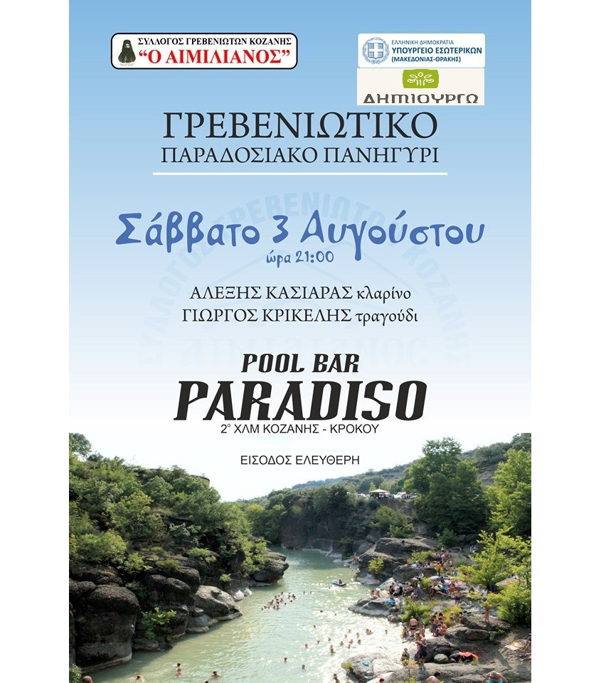 Στο «Γρεβενιώτικο Παραδοσιακό Πανηγύρι», που θα πραγματοποιηθεί στις 9 το βράδυ, στο Paradiso pool-bar στο 2ο χιλιόμετρο Κοζάνης-Κρόκου θα εμφανιστούν οι: Αλέξης Κασιάρα στο κλαρίνο και Γιώργος Κρικέλης στο τραγούδι.